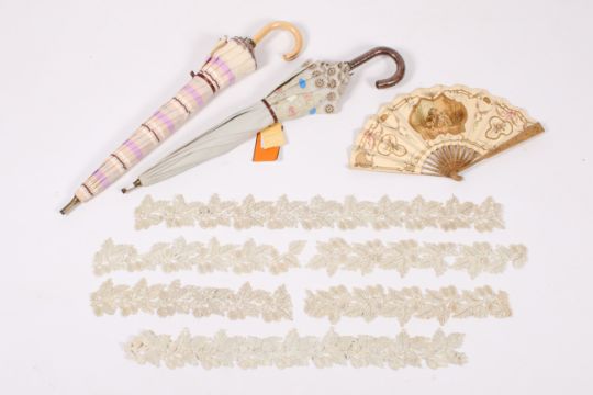 An assortment of vintage fashion accessories. Comprising two parasols, including a Neisha Crosland example with a striped cover and one with an embroidered floral cover, a Savoy Hotel London folding fan and lengths of white beading and appliques. Largest L62cm Condition Report: Umbrellas- a little dirt to outer folds, mechanisms function well.Fan - short tears to top of folds, stains along creases.Beading - long lengths damaged with loose beads and threads.