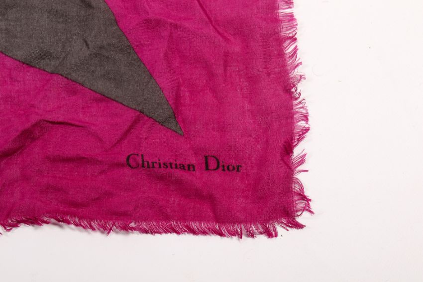 Two designer woven scarves. Comprising a Faliero Sarti 70% cashmere and 30% silk light brown example with frayed edges, 165cm x 165cm and a Christian Dior 65% cashmere and 35% silk brown and pink example, 135cm x 140cm.