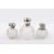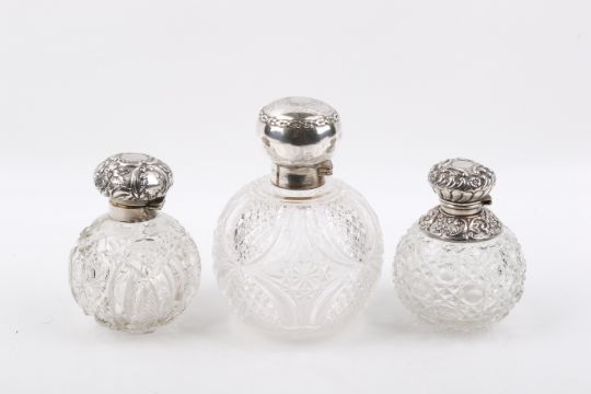 Three silver topped scent bottles. Each with hinged lid, various hallmarks, over cut glass bulbous containers. Largest H13.5cm.