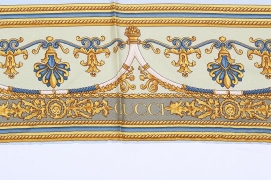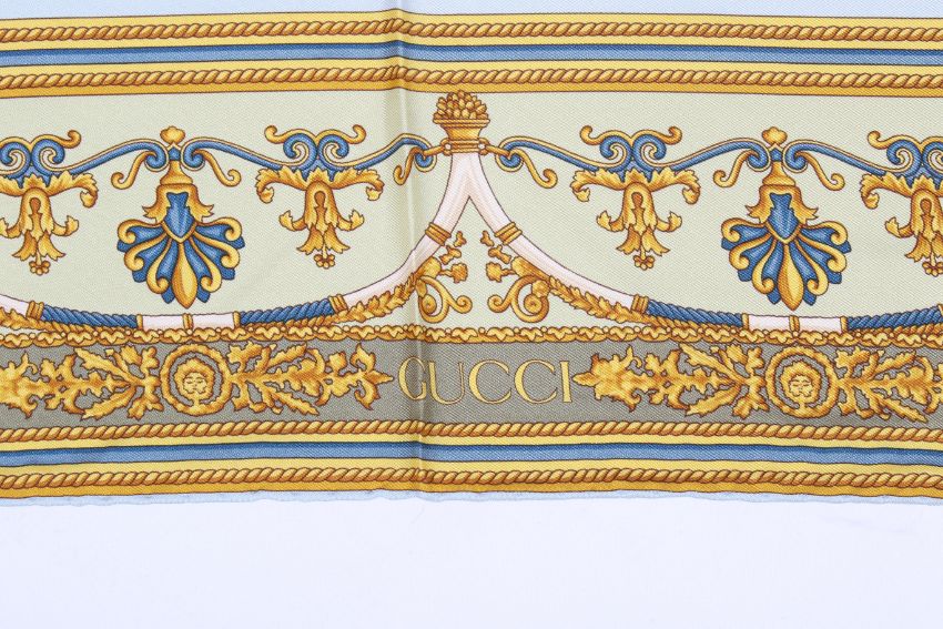 A Gucci silk 'Chairs' scarf. The assorted upholstered chairs against a pale blue ground, with a gold, blue and pale green border, with small label, circa 86cm x 86cm.