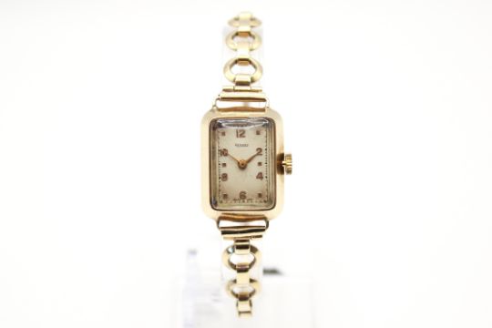 A 9ct gold Rotary cocktail watch. Gilt Arabic numerals to the rectangular cream face, case 2.2cm x 1.6cm, hallmarked to inside back case and clasp of part elasticated bracelet strap. Gross weight 14.7g.