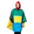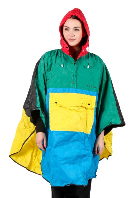 A vintage 1980s Mary Quant PVC poncho rain cape. The semi-circular rain poncho formed from four thin sheets of multicoloured waterproof PVC, with a drawstring hood and patch pocket on the front. Accompanied by a red drawstring carrying pouch bag and leaflet. A similar example to be found at the V&A Museum.