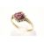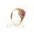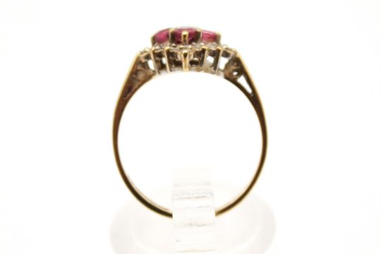 A 9ct gold and ruby dress ring. Set with a rhombus of round faceted rubies and small single cut diamonds, hallmarked, size M, gross weight 1.9g.