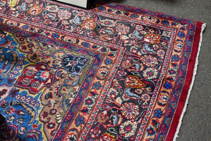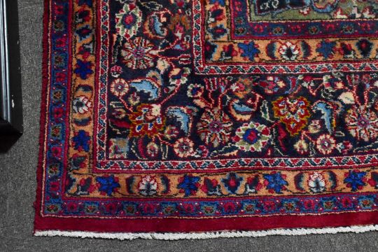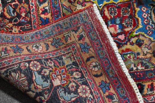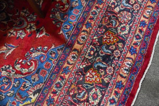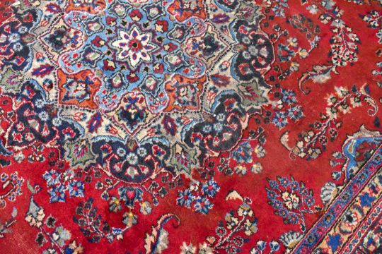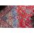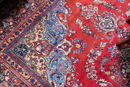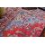 Rug is contemporary but shows some wear and staining, particularly in central red area.