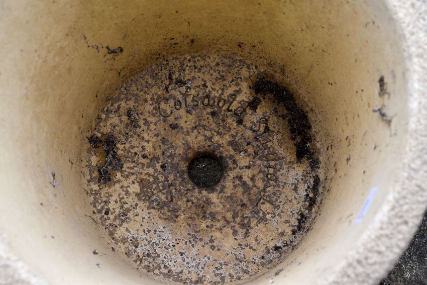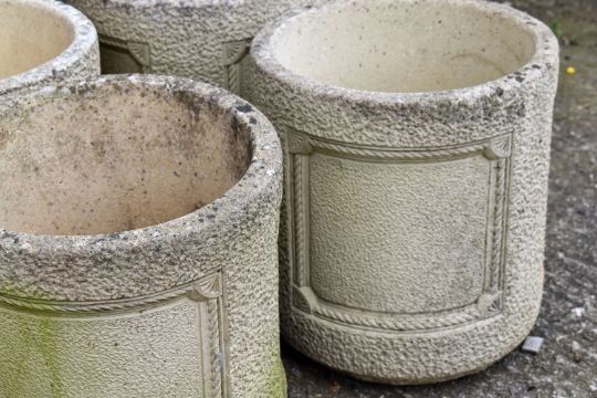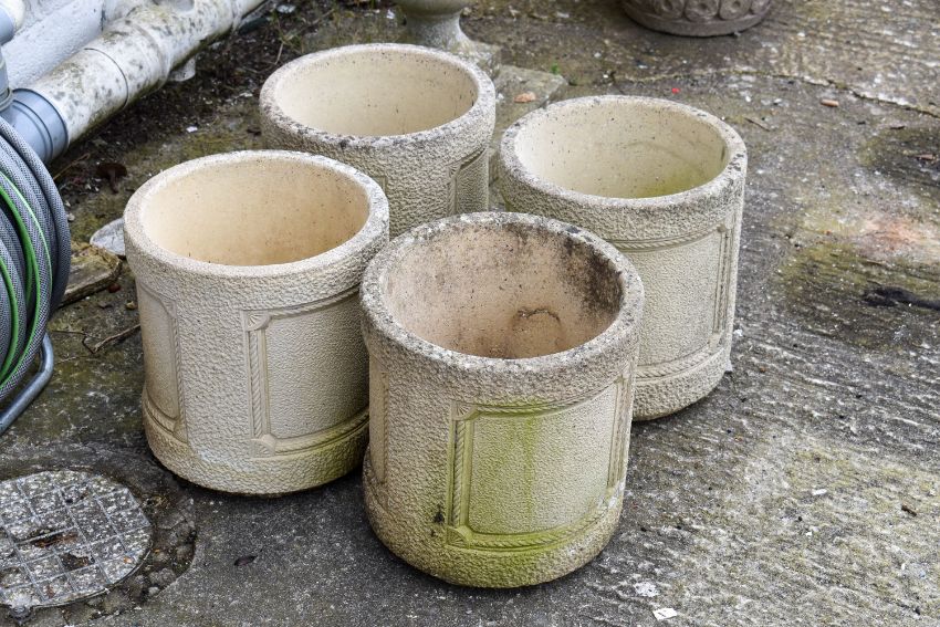 Four matching 20th century Cotswold studios Ltd deep weathered stone garden planters, each inscribed to inner base with makers name and model number 'U33'. Each, width 33cm, Height 36cm