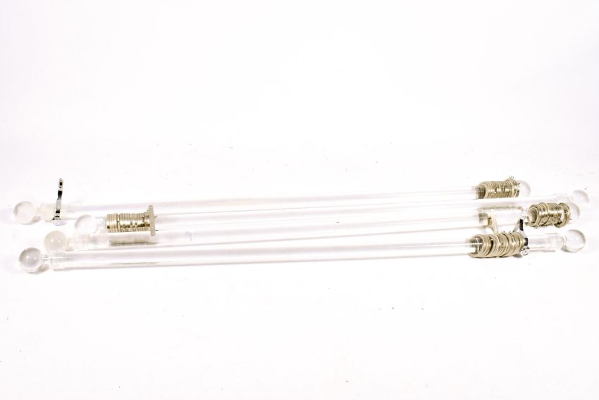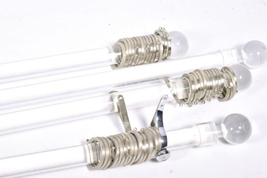 A set of four contemporary clear plastic curtain poles. With curtain rings. 192cm long