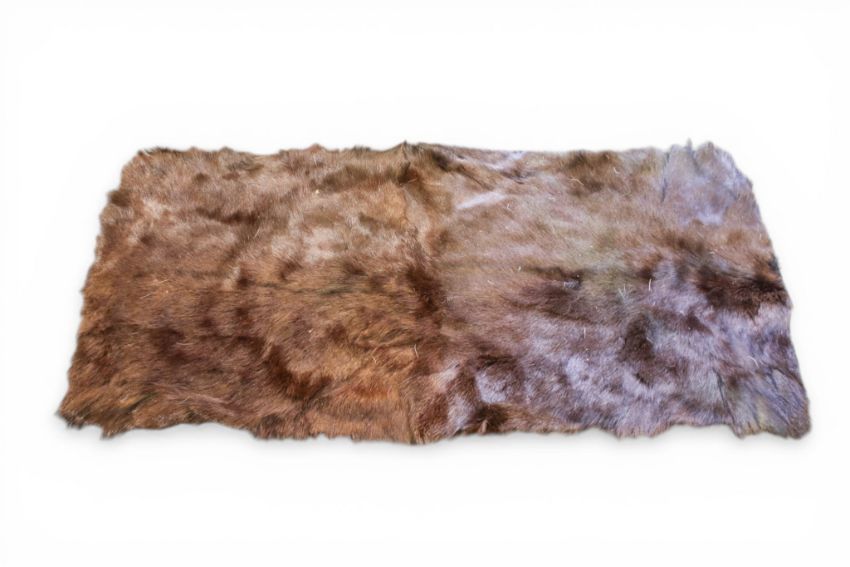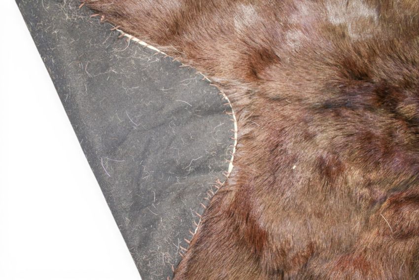 A taxidermy dark brown fur skin rug with a cloth backing. 160cm x 72cm