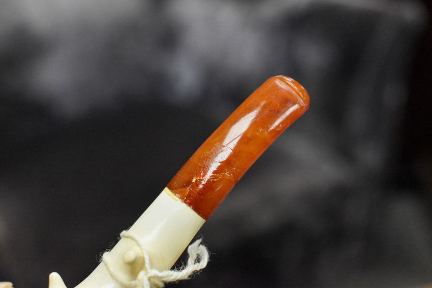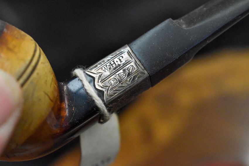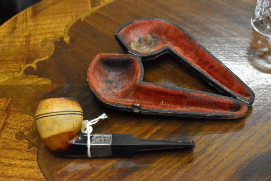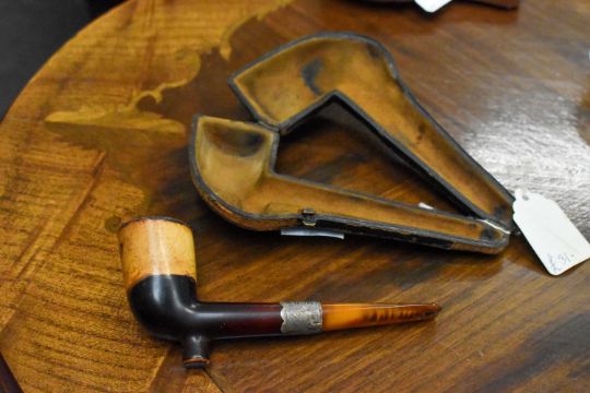 A group of interesting miscellaneous collectables. Including two prattware pot lids, three smoker's pipes and a fishing reel, etc.